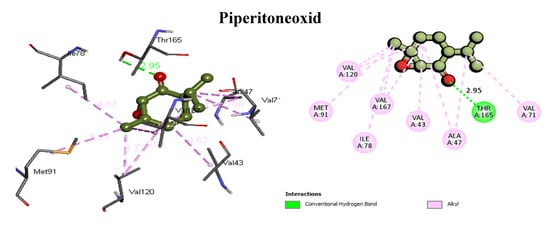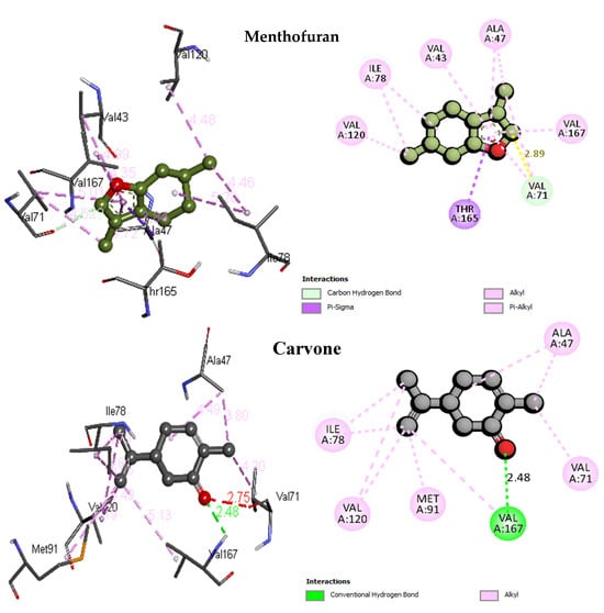 Moreover, the key amino acids Val43, Val71, Thr165, and Val167 at the binding site of the active pocket formed one H-bond interaction with six ligands, namely carvone (Val167, 2.48 Å), linalool (Val43, 1.94 Å), menthol (Val43, 2.06 Å), menthyl acetate (Thr165, 2.05 Å), piperitoneoxide (Thr165, 2.95 Å), and P-menth-2-en-ol (Val71, 2.08 Å), besides some other hydrophobic interactions. Furthermore, the rest of the list (Table 1) displayed a number of hydrophobic interactions ranging from 4 to 7 (alkyl) with the key amino acids at the active site. Piperitoneoxide (HB, Thr165, 2.95 Å), menthofuran (C–HB, Val71, 2.89 Å), and carvone (HB, Val167, 2.48 Å) (Figure 2) were depicted as the top three binders with the highest molecular interactions (H-bond, C–HB, π-σ, π-alkyl, and/or alkyl) with 8, 7, and 7 interactions, respectively, with binding affinities of −5.17, −5.77, and −5.57.