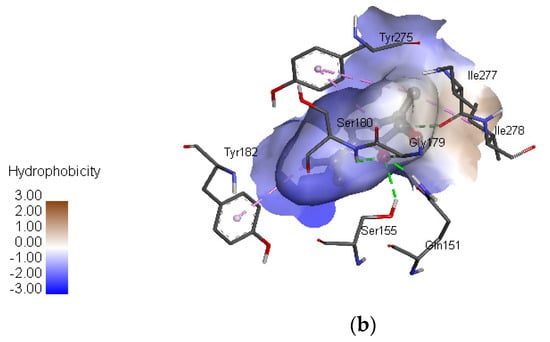 In addition, Nikaido [47] confirmed that this diversity is essential for the binding of various AcrB substrates and/or inhibitors, which should be characterized with hydrophobic groups to form hydrophobic interactions and atoms to create hydrogen bonds (Figure 3b).