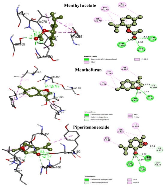 The most important amino acid residues that rendered stability to the bound ligand and protein complexes and were common in almost all ligands’ interactions are Tyr182, Tyr275, Ile277, Ile278, Leu293, and Phe617 that formed a hydrophobic trap, with which the frontrunner compounds (carvone, iso-pulegone, limonene, menthofuran, menthol, menthyl acetate, piperitenone, piperitenoneoxide, piperitone, P-menth-2-en-ol, pulegone) recorded alkyl, and/or π-alkyl interactions. Meanwhile, Table 1 revealed the predominant H-bond interactions, briefly, one HB for cineol (Gly296, 2.01 Å), iso-menthone (Gly272, 1.84 Å), iso pulegone (Gln151, 2.04 Å), linalyl acetate (Thr624, 1.96 Å), menthone (Ile277, 2.55 Å), piperitenone (Gln151, 2.04 Å), piperitone (Gln151, 1.94 Å), piperitoneoxide (Gly272, 2.50 Å) and P-menth-2-en-ol (Ile277, 2.07 Å), two HBs for carvone (Ser155, 2.59 Å; Ser180, 1.71 Å), linalool (Gln151, 1.74 Å; Ile277, 1.69 Å), menthofuran (Gln151, 2.13 Å; Ser155, 2.48 Å), menthol (Gln151, 1.83 Å; Ile277 2.24 Å), pulegone (Gln151, 2.16 Å; Ser180, 2.51 Å) and neoisomenthol (Gln151, 1.87 and 2.08 Å). Moreover, three HBs were recorded for menthyl acetate (Gln151, 2.32 Å; Ser155, 2.30 Å; Ser180, 1.92 Å) and piperitenoneoxide (Gln151, 1.83 Å; Ser155, 2.66 Å; Ser180, 2.37 Å). Hence, and from the frontrunner list, menthyl acetate, menthofuran, and piperitenoneoxide (Figure 4) were portrayed as the top three best binders, having free energy of binding of −6.07, −6.04 and −5.94 kcal/mol and molecular interactions (H-bond, π-alkyl) of 6, 6, and 8, respectively. Additionally, Gln151, Ser155, and Ser180 represented the best key amino acids in the active pocket for HB interactions, and Tyr275, Tyr182, and Ile278 represented the best key amino acids for alkyl interactions, as shown in Figure 4.