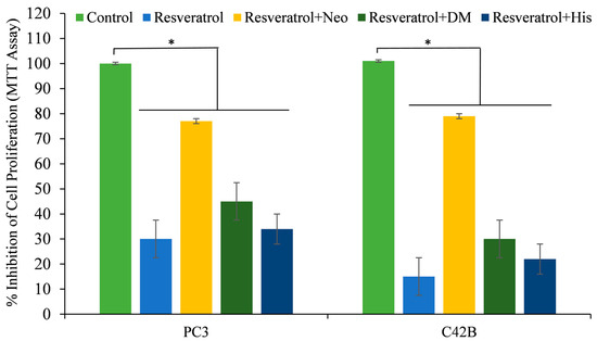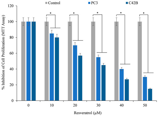 The prostate cancer cell lines, PC3 and C42B, were cultured with specified doses of resveratrol for 72 h. The effect on cell proliferation was determined using the MTT test, as outlined in Section 2. The data are presented as a percentage of the control value, with the standard error (±S.E.) calculated from three independent experiments. * p < 0.05 indicates a statistically significant difference compared to the corresponding untreated control (i.e., 0 µM resveratrol).