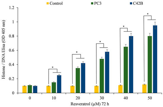 The Histone/DNA ELISA technique was employed to identify apoptosis in cells from the PC3 and C42B prostate cancer cell lines. The cells were incubated for 72 h with varying doses of resveratrol, as shown in the figure and outlined in Section 2. The values presented represent the standard error (±S.E.) of three separate studies. * p value < 0.01, compared to control.