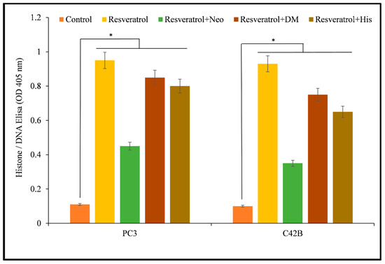 In addition, Histone/DNA ELISA was utilized to evaluate the apoptotic induction of resveratrol in the two prostate cancer cell lines that were mentioned earlier (Figure 3). According to these findings, resveratrol was able to suppress the proliferation of cancer cell lines and trigger apoptosis in those cells. Previous studies have demonstrated that resveratrol possesses anticancer activities against a variety of cancer cell lines [1,15,17,18,19,21,40]. These findings provide further evidence that resveratrol possesses anticancer properties.
