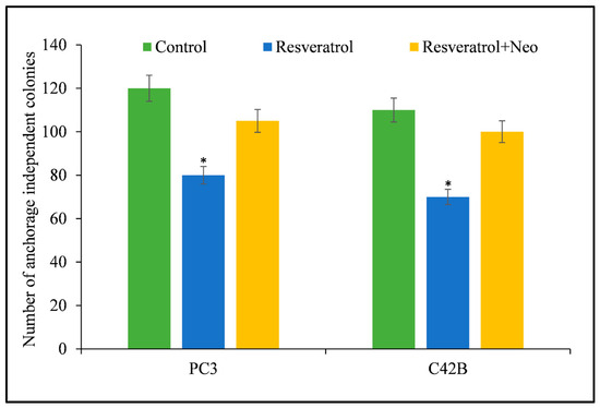 PC3 and C42B prostate cancer cells, (with a count of 3 × 104), were placed in 24-well plates following the procedure outlined in Section 2. The cultures were enhanced with resveratrol at a concentration of 25 µM, either with or without 50 µM of the cuprous chelator neocuproine (Neo). The experiments were conducted three times and the average values are presented. * p value < 0.01 when compared to control. Neocuproine was utilized as a negative control in the experiment, and it did not impact the number of cancer cells that were able to grow independently of anchoring.