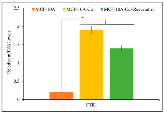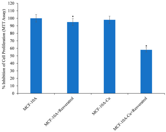 The effect of resveratrol on the suppression of cell proliferation was examined in MCF-10A cells (non-tumorigenic epithelial cells) and MCF-10A cells cultured in a medium supplemented with copper (MCF-10A+Cu). Resveratrol was administered at a concentration of 25 µM to both “MCF-10A” and “MCF-10A+Cu” cells, with the latter being non-tumorigenic cells cultured in a medium containing 25 µM CuCl2. The duration of the treatment was 72 h. Afterward, cell proliferation was assessed using the MTT assay as outlined in Section 2. The values presented represent the standard error (±S.E.) of three separate studies. * p value < 0.05 when compared to control.