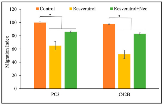 The impact of resveratrol on the migration of PC3 and C42B prostate cancer cells when the copper chelator neocuproine is present. The experiment described in Section 2 involved conducting a cell migration test using 24-well transwell permeable supports with 8 mm pores. The cells were produced in the presence and absence of resveratrol (25 µM) and neocuproine (50 µM). The fluorescence of the moving cells was quantified using an Ultra Multifunctional Microplate Reader. The values presented represent the standard error (±S.E.) of three separate studies. * p value < 0.01 when compared to control.