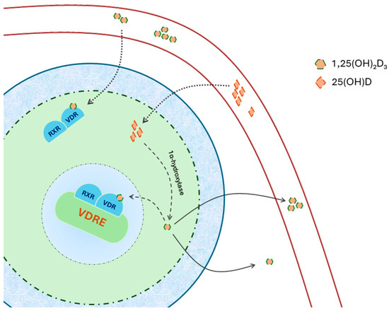 The dimer formed by 1,25(OH)2D3–VDR2 interacts with the retinoid X receptor (RXR) and translocates into the nucleus. Within the nucleus, it attaches to vitamin D response elements (VDRE) found in the promoter region of specific genes. 25(OH)D obtained from the bloodstream can be converted locally into 1,25(OH) D within cells expressing 1α-hydroxylase. Adapted from Latic [29].