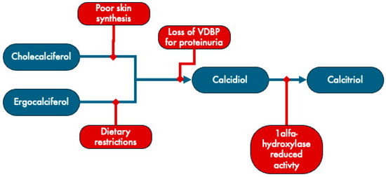 Due to various factors, individuals with CKD frequently encounter deficiencies in both calcidiol and calcitriol (Figure 2). CKD hampers the activity of 1α-hydroxylase CYP27B1, the enzyme responsible for hydroxylation of calcidiol into calcitriol [55,56]. Moreover, this deficiency can result from compromised skin synthesis or dietary constraints, restricting the access to cholecalciferol and ergocalciferol precursors. Additionally, proteinuria and uremia associated with chronic kidney disease (CKD) can lead to the depletion of vitamin D binding proteins and 1,25-dihydroxyvitamin D [55].