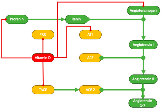 The role of vitamin D in renin–angiotensin–aldosterone system (RAAS) inhibition is nowadays undisputed [71,72]. In experimental models of chronic kidney disease, paricalcitol, a synthetic analogue of vitamin D, diminishes the renal expression of renin, the (pro)renin receptor, angiotensinogen, and the type 1 angiotensin receptor. Furthermore, vitamin D hinders the activity of tumor necrosis factor α-converting enzyme (TACE), which controls the shedding of angiotensin-converting enzyme 2 (ACE2), a crucial enzyme responsible for metabolizing angiotensin II in the proximal tubule (Figure 3) [72,73].