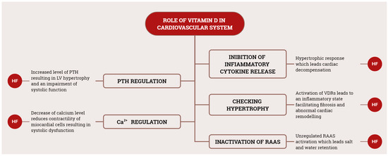 Patients with HF exhibiting low vitamin D levels tend to experience unfavorable outcomes, aligning with established clinical correlations and biomarkers [154]. In the context of HF affecting myocardial cells, the surplus of ionized calcium (Ca2) detrimentally impacts the contraction and relaxation of the heart [155]. Conversely, vitamin D deficiency may perturb the activities of Ca2 in cardiac cells, contributing to fibrosis, intra-organizational inflammation, and cardiomyocyte hypertrophy [156,157]. Additionally, diminished vitamin D levels can induce inflammation, activate the renin–angiotensin system, and lead to endothelial dysfunction [158].