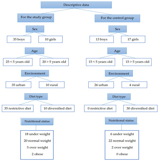 Based on gender, the study group comprised 35 boys and 10 girls, while the control group was 13 boys and 17 girls. Distribution by age consisted of 25 children under 5 years old and 20 children over 5 years old in the study group, whereas the control group included 15 children under 5 years old and 15 children over 5 years old. In terms of urban or rural origin, 35 children in the study group were from urban areas and 10 from rural areas, compared to 26 urban and 4 rural children in the control group. Regarding dietary habits, 35 children in the study group followed a restrictive diet, while 10 had a varied diet. In contrast to children in the study group, all children from the control group had a varied diet. Nutritional status varied in the study group, with 18 children classified as underweight, 20 with a normal weight, 5 children as overweight, and 2 were obese. In the control group, 23 had normal weight, 6 children were underweight, and 2 were overweight (Figure 2).