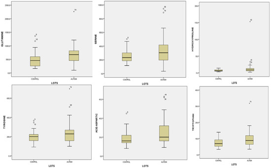 Urine level of glutamine, serine, hydroxylysine, tyrosine, aspartic acid, and tryptophan in the study group (autism) versus the control group. Cases with extreme values outside the 95% CI (outliers) are represented by circles and asterisks in the boxplot.