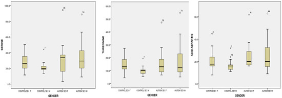 Urine serine, threonine, and aspartic acid levels by male and female sex for the control group and the study group (autism). Cases with extreme values outside the 95% CI (outliers) are represented by circles and asterisks on the boxplot.