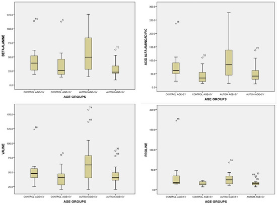 Urine beta-alanine, alpha aminoadipic acid, valine, and proline levels by age: <5 years and >5 years for the control group and study group (autism). Circles and asterisks represent the cases with extreme values outside the 95% CI (outliers).