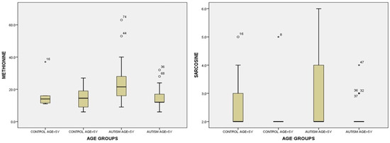 Urine methionine and sarcosine levels by age: <5 years and >5 years for the control group and study group (autism). Cases with extreme values outside the 95% CI (outliers) are represented.