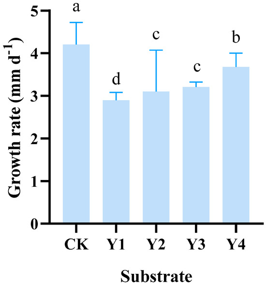 Mycelial growth rate of P. eryngii cultivated in different substrates. Different lowercase letters denote significant differences in each column (p < 0.05 according to Duncan’s test).