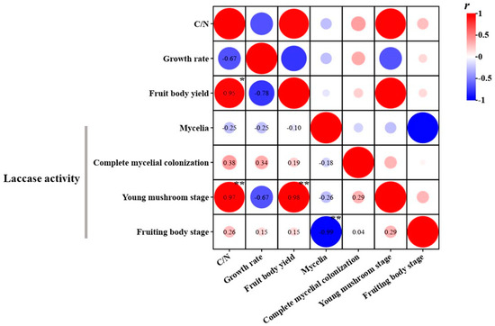 Laccase is the main polyphenol oxidase involved in lignin degradation and studies have shown that it plays an important role in growth and development [43]. Laccase activity can be affected by various factors such as carbon and nitrogen sources, metal ions and activators, and pH [44]. Among the four stages, mycelia, complete mycelial colonization, young mushroom stage and fruiting body stage, complete mycelial colonization had the highest laccase activity. Substrate Y1 (treated with 21% G. biloba leaf powder and sugarcane bagasse) had the highest laccase activity at complete mycelial colonization compared to the other substrate (Table 4); it may secrete a substantial amount of laccase enzyme to break down the substrate, fulfilling its nutritional requirements of the growth and development of P. eryngii. Yet, as the fruiting body reaches maturity, the substrate becomes depleted, and the mycelium ages, resulting in a decreased production of the laccase enzyme. There was a significant positive correlation between the laccase activity of the young mushroom stage and the P. eryngii yield. However, mycelial growth rate was not positively correlated with the level of laccase activity, which is consistent with the results of a previous study by Zhao et al. [45].