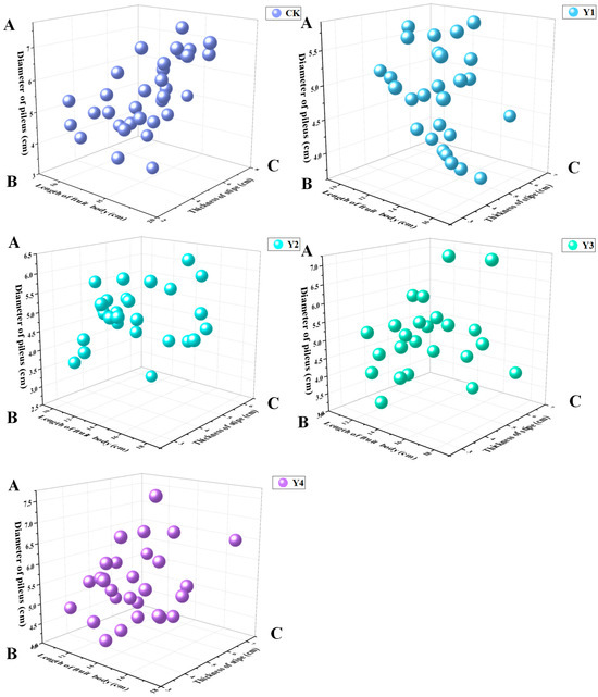 Scatter plot of the agronomic characteristics of fruiting body. A (Y axis): diameter of pileus (cm), B (X axis): length of fruiting body (cm), and C (Z axis): diameter of pileus (cm).