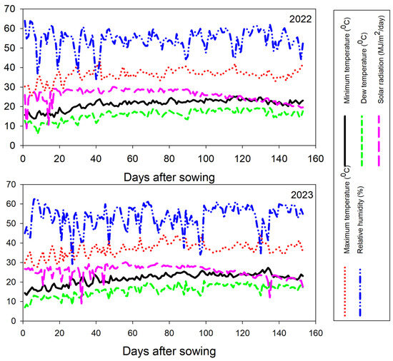 The minimum and maximum temperatures along with solar radiation levels, were recorded across the growing seasons.