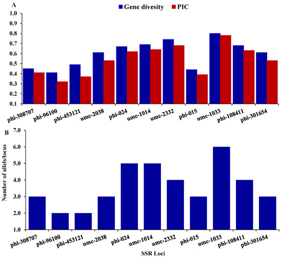 (A) depicts gene diversity and Polymorphic Information Content (PIC) for each marker, and (B) illustrates the number of alleles per locus.