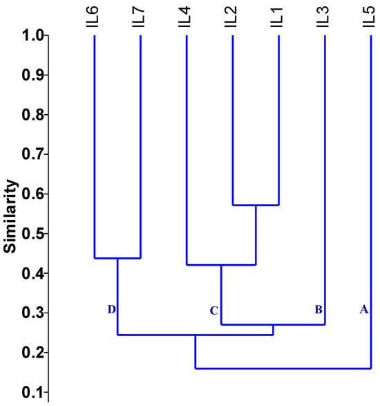 The genetic distance assessed using SSR markers fluctuated from 0.43 to 0.88, with an average of 0.73, as shown in Table 1. The minimum genetic distance was observed between inbred lines IL1 and IL2 (0.43). In contrast, the maximum genetic distance of 0.88 occurred between the inbred lines (IL1 and IL5), (IL2 and IL5), and (IL4 and IL5). The dendrogram constructed based on the genetic distance matrix grouped the evaluated inbred lines into four primary clusters, each with varying levels of genetic diversity (Figure 3). Group A consisted only of IL5 and group B contained IL3. Group C contained three lines divided into two subgroups: the first subgroup included IL1, IL2, while the second subgroup comprised IL4. Group D included IL6 and IL7.