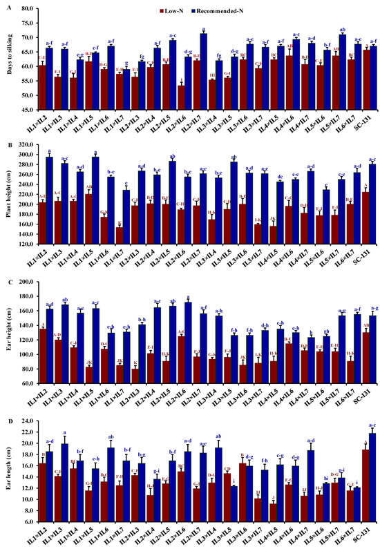 Comparative performance of developed 21 F1 hybrids and check hybrid (SC-131): 1 days to silking (A), plant height (B), ear height (C), and ear length (D). The bars on the tops of the columns represent the SE, and different letters on the columns show the significant difference using the Least Significant Difference (LSD) (p < 0.05). The uppercase letters belong to low N while the lowercase letters belong to the recommended conditions.