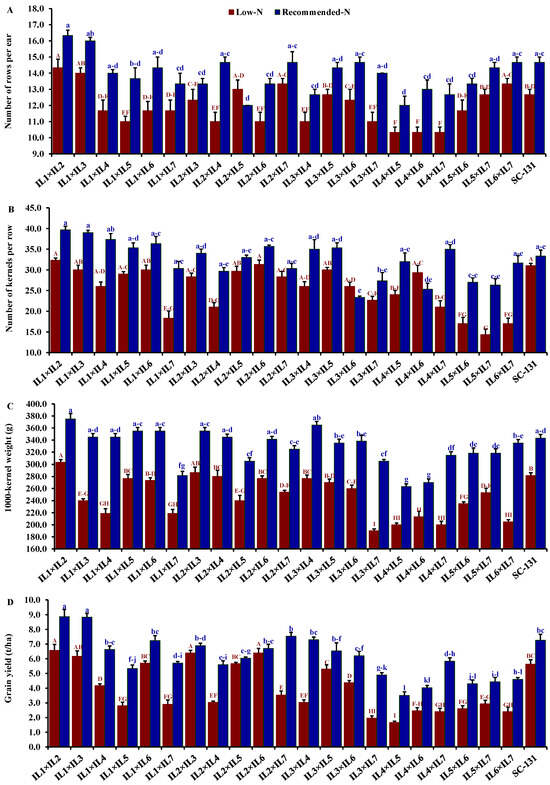 Comparative performance of developed 21 F1 hybrids and check hybrid (SC-131): number of rows per ear (A), number of kernels per row (B), 1000-kernel weight (C), and grain yield (D). The bars on the tops of the columns represent the SE, and different letters on the columns show the significant difference using the Least Significant Difference (LSD) (p < 0.05). The uppercase letters belong to low N while the lowercase letters belong to the recommended conditions.