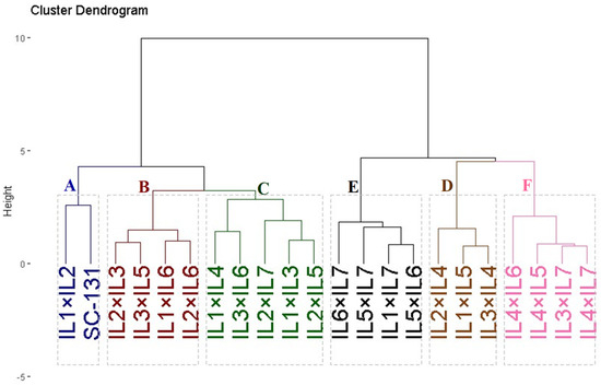 Twenty-one developed F1 maize hybrids and the commercial check SC-131 were clustered based on yield characteristics such as the number of rows per ear, ear length, 1000-kernel weight, kernels per row, and grain yield. These hybrids were divided into six groups using hierarchical clustering, as depicted in Figure 6. Group A, comprising two hybrids (IL1×IL2 and SC-131), exhibited the highest yield and related traits. Group B included four hybrids (IL2×IL3, IL3×IL5, IL1×IL6, and IL2×IL6) characterized by high yield traits. Groups C and D contained five and three hybrids and showed moderate yield traits. Conversely, Groups E and F encompassed hybrids with the lowest agronomic performance.