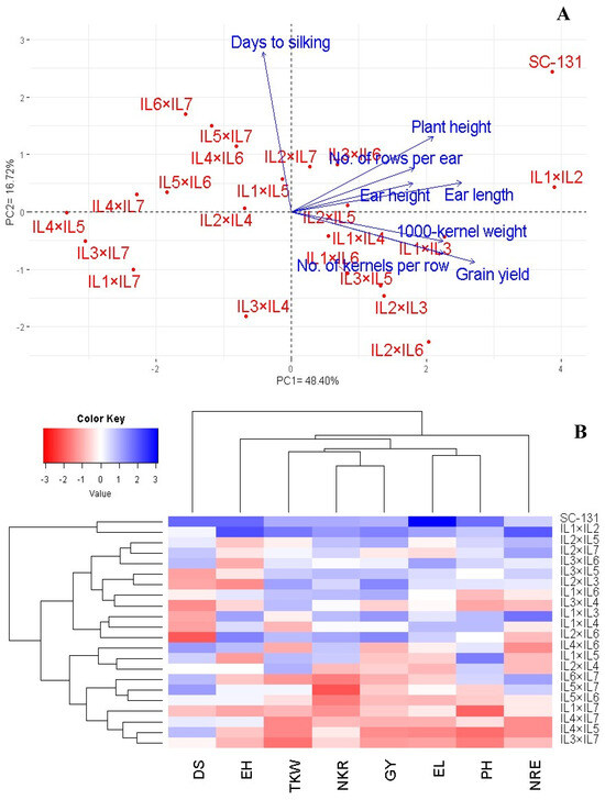PC-biplot (A) and heatmap and hierarchical clustering (B) were used to study the association between agronomic traits and develop maize hybrids. PH: plant height; DS: days to silking; EL: ear length; NRE: number of rows/ear; NKR: number of kernels/row; GY: grain yield; and TKW: 1000-kernel weight.