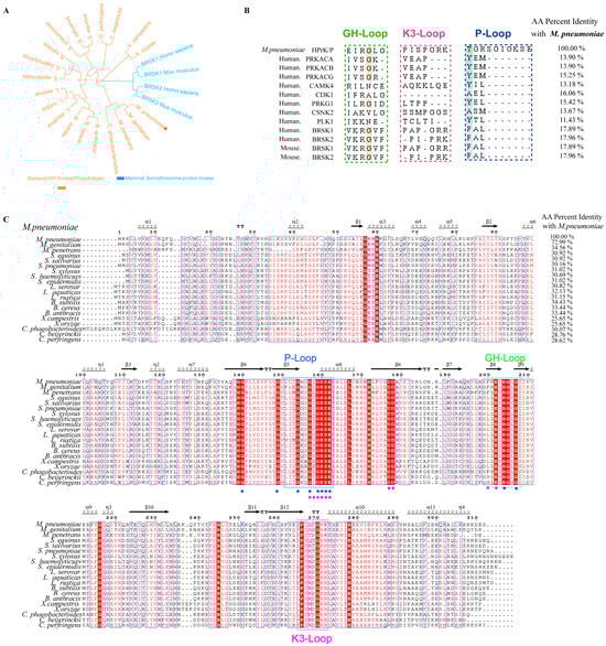 Homologous analysis of M. pneumoniae and bacterial HPrK/P sequences. (A) Phylogenetic relationship of human, Mycoplasma and bacterial HPrK/P sequences. The phylogeny of the amino acid sequences was estimated by the neighbor-joining method for the HPrK/P of Mycoplasma and bacteria, serine/threonine kinase proteins (BRKPs) for the human and mouse deposited in the UniProt database (Table S1). (B) Sequence alignment of M. pneumoniae HPrK/P and various human serine–threonine protein kinase families. (C) Alignment of bacterial HPrK/P sequences. The secondary structure at the top is defined by DSSP for the M. pneumoniae. The highly conserved sites in the enzyme activity test are marked with blue stars, and the highly conserved sites in the docking interaction analysis are marked with pink stars.