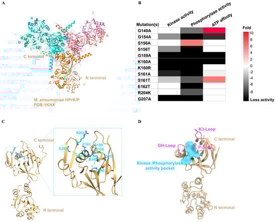 Mycoplasma pneumoniae is a significant cause of respiratory infections in school-age children globally, responsible for 20–40% of community-acquired pneumonia cases in this age group. Approximately 10% of infected children ultimately develop infectious pneumonia, with a global epidemic peak occurring every 3–7 years [,,,]. M. pneumoniae is transmitted through airborne droplets, and the number of infections worldwide has increased rapidly [,,]. It is important to note that there is currently no effective vaccine for M. pneumoniae []. M. pneumoniae is recognized as a leading cause of respiratory diseases in humans []. It is a small prokaryotic microorganism that lacks a cell wall and only has a cell membrane. Its genome is approximately 816 kb in size and encodes 688 predicted ORFs [,]. The attachment organelles consist mainly of P1, P30, P40, P90, and high-molecular-weight protein 1 (HMW1) and 3 (HMW3). The P1 protein is an immunodominant protein that mediates M. pneumoniae adhesion to host cell membranes. It can directly bind to membrane surface receptors [,]. The CARDS toxin, encoded by gene MPN372, is a unique bacterial ADP-ribosylation and vacuolar toxin that induces Community-Acquired Respiratory Distress Syndrome (CARDS) []. The gene MPN400 encodes IbpM, an immunoglobulin-binding protein that strongly binds to various immunoglobulins (IgM, IgG, and IgA) produced by the host, thereby evading the host’s immune responses []. In M. pneumoniae metabolism, HPrK/P, the HPr kinase/phosphatase, can phosphorylate and dephosphorylate HPr, the histidine-containing protein, at residue serine 46. Phosphorylated HPr, as part of the phosphotransferase system (PTS), regulates carbohydrate transport and metabolism [,]. In comparison to eukaryotic Ser/Thr protein kinases, the sequence of M. pneumonic HPrK/P exhibits lower homology with eukaryotic Ser/Thr protein kinases. It lacks the highly conserved sequence motif that is characteristic of the eukaryotic protein kinase family. Instead, it contains the walker motif A (G/AxxxxGKT/S), which is present in many nucleotide-binding proteins and forms a typical ring [], called P-Loop, that binds the phosphate group of ATP. The presence of the walker motif in HPrK/P suggests that it belongs to a new family of Ser/Thr protein kinases.