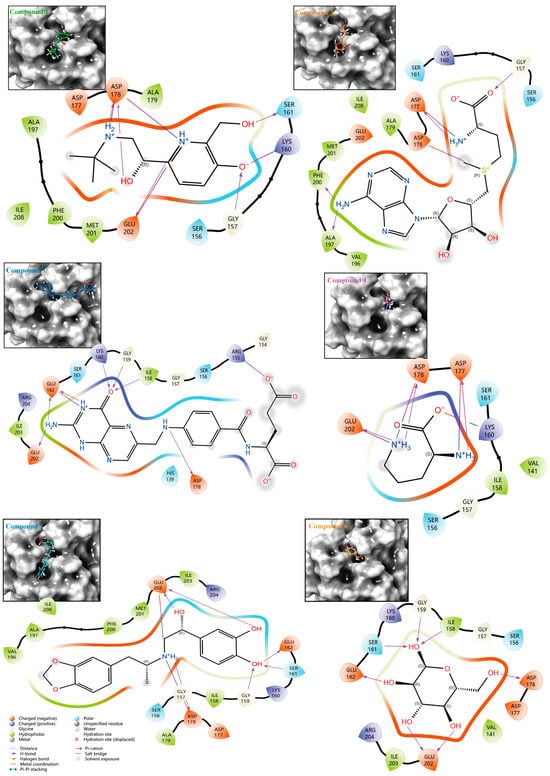 To rapidly screen candidate inhibitors of HPrK/P, we completed a targeted virtual screening of 2614 FDA-approved drugs and 948 bioactive small molecules for HPrK/P using Schrödinger’s Computational Platform for Molecular Discovery (Release 2019-2, Schrodinger LLC, New York, NY, USA, 2019) to achieve ‘new use of old drugs’ and avoid drug toxicity and unclear targets. Finally, we selected the top 10 small molecules (Table 1) based on the MM/GBSA binding free energy. And then, we performed protein–ligand interaction analysis on the docking results of the top six small molecules (Figure 3). It is obvious that the top six compounds docked into the same active pocket. We systematically analyzed the protein–ligand interaction network and counted the number of interactions between each compound and protein amino acids. Compound 1 exhibits the formation of five hydrogen bonds with amino acids Gly157, Ser161, Asp178, and Glu202. Compound 2 establishes three hydrogen bonds with amino acids Gly157, Asp177, and Phe200. In the case of Compound 3, six hydrogen bonds are observed with amino acids Ile158, Lys160, Glu162, Asp178, and Glu202. Compound 4 forms three hydrogen bonds with amino acids Asp177, Asp178, and Glu202. Compound 5 demonstrates the involvement of six hydrogen bonds with amino acids Gly159, Ser161, Glu162, Asp178, and Glu202. Lastly, Compound 6 engages in six hydrogen bonds with amino acids Ile158, Gly159, Ser161, Glu162, Asp178, and Glu202. In addition, the top six compounds formed multiple hydrophobic, salt bridge and polar interactions with other amino acid residues (Table 2). It is worth mentioning that most of the residues that form hydrogen bonds and interact with the top six compounds are located on the P-loop and GH-Loop. Although the other amino acids are not located on the P-loop and GH-loop, such as Val141, Ile158, Asp177, Asp178, Glu202, Ile208, these amino acid residues are also highly conserved in M. pneumoniae and bacterial HPrK/P (Marked with a pink star in Figure 1C). In addition, we analyzed the hydrogen bond interaction sites of small molecules 3, 5, 6 with HPrK/P in a molecular dynamics simulation, and selected three complex trajectories at 20 ns, 60 ns, and 100 ns (Figure 4). The results show that the amino acids which form hydrogen bonds with HPrK/P are also highly conserved in molecular dynamics simulation. This suggests that these small molecule candidates may not only be inhibitors of M. pneumoniae HPrK/P kinases, but also have potential as broad-spectrum inhibitors of bacterial HPrK/P kinases.