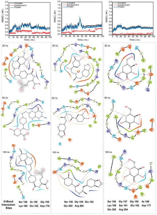 Analysis of the interaction between compounds 3, 5, 6 and protein in a molecular dynamic simulation. Conformational snapshots were extracted from the simulation at 20 ns, 60 ns, and 100 ns, and a 2D interaction plot was generated. The residues involved in hydrogen bond formation are listed statistically on the right side of the diagram.