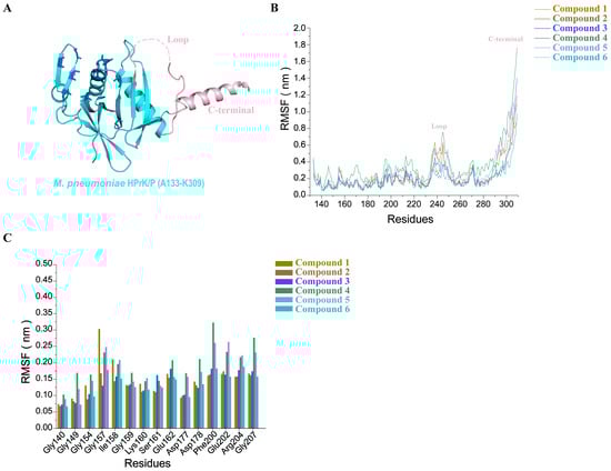 The MD simulation (RMSF analysis) of HprK/P–compound 1, HprK/P–compound 2, HprK/P–compound 3, HprK/P–compound 4, HprK/P–compound 5, HprK/P–compound 6 complexes for 100 ns. (A) The C-terminal domain of M. pneumoniae HPrK/P shown in the cartoon. The residues that form an H-bond with the top six compounds are shown in the form of a blue stick. (B) The RMSF analysis of the top six complexes. The loop and C-terminal regions are colored pink (Figure 5A). (C) The RMSF analysis of the highly conserved residues that form an H-bond with the top six compounds.