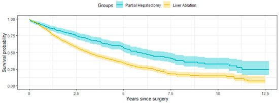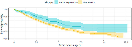 For the subgroup analysis with tumor size less than or equal to 3 cm, the final cohort included a total of 660 eligible participants, with 116 in the partial hepatectomy group and 544 in the ablation group. Additional information on sample selection is available from the authors. The overall mortality of the partial hepatectomy group was 46.6%, and the median survival time was 5.3 years (Figure 3). For the ablation group, they were 61.9% and 3.7 years, respectively. Similarly to the main cohort, without the adjustment for the confounders, patients who received partial hepatectomy had a longer overall survival (p-value < 0.001 by a log-rank test). The Bayesian Logistic regression results and the Bayesian survival analysis results were summarized in Supplementary Tables S6 and S7. We also examined the balance of the two arms after weighting and found similar performance as the main analysis. Some results different from the main analysis were obtained. Specifically, tumor size was no longer significant in choosing the surgical procedures. While ablation had an association with worse survival, this effect was no longer statistically significant, with an estimated log hazard ratio of 0.14 (hazard ratio = 1.15) and a 95% credible interval of (−0.13, 0.42); the corresponding 95% credible interval for HR is (0.88, 1.52). Other variables significantly associated with survival were age at diagnosis, marital status, Elixhauser comorbidity score, Hepatitis B, portal hypertension, and hepatic encephalopathy/coma.