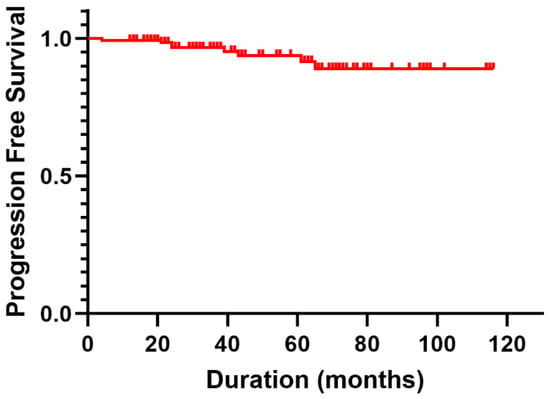 During the follow-up period, progression occurred in eight patients (5.4%). Notably, the 1-, 2-, and 5-year PFS rates were 99.3%, 96.7%, and 93.8%, respectively, as illustrated by the Kaplan–Meier curves in Figure 1. Among the eight patients with recurrent meningiomas, three underwent open resection, five underwent repeat SRS, and one who underwent repeat SRS for meningothelial meningioma exhibited malignant progression to atypical meningioma, ultimately requiring resection.