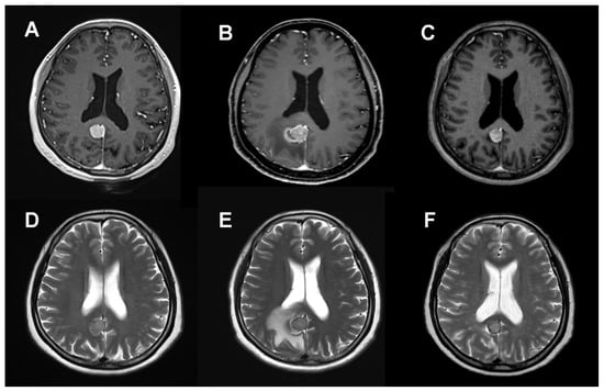 Axial contrast-enhanced T1- and T2-weighted magnetic resonance imaging scans of meningioma at the posterior falx at the time of radiosurgery (A,D), 6 months later (B,E), and 3 years later (C,F). The 6-month follow-up images demonstrate peritumoral edema around the treated meningioma, which was managed with high-dose steroids. Meningioma and peritumoral edema were stabilized 3 years after radiosurgery. Radiosurgery was performed using a tumor margin dose of 15 Gy.