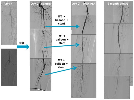 Catheter-directed thrombolysis (CDT) performed via access from a radial artery. Selective angiography performed using a radial approach (over a 5F pigtail catheter) shows a left common femoral artery occlusion without distal run-off. (Day 1) A guidewire transversal test, in which the lesion was passed with an 0.18-inch guidewire, was conducted over a multiport thrombolytic catheter. CDT was then initiated. On the first postoperative day, control angiography shows incomplete thrombus resolution and distal embolisation. (Day 2—control) Mechanical thrombectomy, additional balloon angioplasty, and stent implantation was performed in the left superficial femoral artery and in the left popliteal artery. Control angiography shows successful recanalisation with acceptable flow in the below the knee arteries. (Day 2—after PTA). Abbreviations: CDT—catheter-directed thrombolytic therapy; MT—mechanical thrombectomy; PTA—percutaneous transluminal angioplasty.