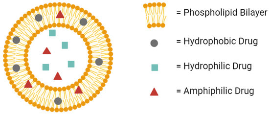 A conventional liposome can hold hydrophobic drugs in its lipid bilayer, hydrophilic drugs in its aqueous core, and amphiphilic drugs in either the bilayer or the core. Created with BioRender.com on 24 March 2024.