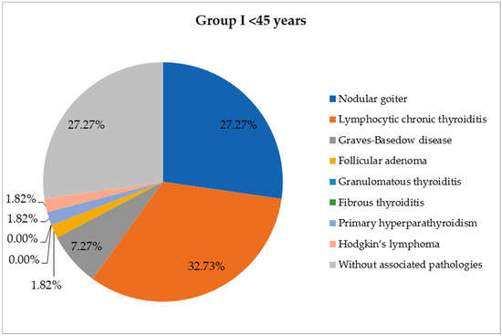 Concerning the pathology associated with thyroid cancer, the incidence of malignancy in patients with thyroid follicular nodular disease (FND) is appreciable. According to some authors, the incidence of thyroid carcinoma associated with FND is between 8.6 and 13% [30]. Graves–Basedow disease has been associated with an increased risk of malignancy. Some authors report a more aggressive evolution of thyroid cancer in patients with hyperthyroidism [31]. Autoimmune/Hashimoto thyroiditis is considered to be a risk factor for the development of thyroid lymphomas (reported in 80% of cases) [32], but it was also diagnosed in 27.6% of cases with PTC [33]. In our study, we observed that FND, chronic lymphocytic thyroiditis, Graves–Basedow disease and follicular adenoma were the most frequently associated lesions. Thyroid neoplasms were more often associated in group I with lesions of lymphocytic thyroiditis and in group II with FND; Graves-Basedow disease was identified more frequently in group I, and follicular adenoma in group II, with the difference being statistically significant (p = 0.0004).