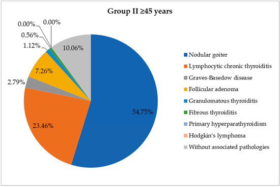 A large part of the patients included in the study presented other thyroid lesions associated with the cancer (Table 1). In young patients, the most common pathology associated with the malignant tumor was chronic lymphocytic thyroiditis (18 cases, 32.73%), followed by primary thyroid follicular nodular disease (FND) (15 cases, 27.27%) and Graves–Basedow disease (4 cases, 7.27%). In elderly patients, malignant tumors appeared more frequently on the background of FND (98 cases, 54.75%); other associated thyroid lesions were chronic lymphocytic thyroiditis (42 cases, 23.46%), follicular adenoma (13 cases, 7.27%) and Graves–Basedow disease (5 cases, 2.79%), with statistically significant differences (p = 0.0004) between the two groups (Figure 2 and Figure 3).