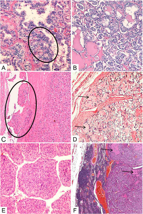 Histopathological types of thyroid cancer: (A) classic PTC subtype, showing papillary growth pattern lined by cells with characteristic nuclear features (circle), H&E staining, original magnification ×200; (B) FVPTC, H&E staining, original magnification ×200; (C) encapsulated, angioinvasive (circle) FTC, H&E staining, ×100; (D) MTC, classic variant, with amyloid deposits in the stroma (arrows), H&E staining, original magnification ×200; (E) PDTC—“insular” type, H&E staining, original magnification ×200; (F) lymph nodal metastasis of a MTC with amyloid deposits in the stroma (arrows), H&E staining, original magnification ×40.