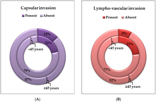 Capsular involvement was identified in 11/52 (21.15%) cases from the first group and 20/157 (12.74%) cases from the second group (p = 0.1756), and lympho-vascular invasion was identified in 12/52 (23.08%) cases from the first group and 12/157 (7.64%) from the second group, respectively, with statistically significant differences (p = 0.0048) (Figure 4C and Figure 5A,B). In two cases of ATC diagnosed upon excisional biopsy, tumor extension at the time of diagnosis and capsular and lympho-vascular invasion could not be specified.