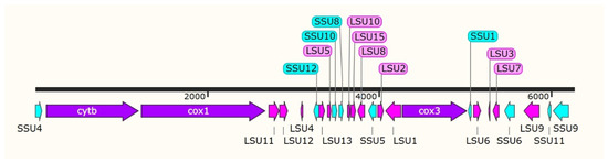 In the existing literature, the mitochondrial genomes of apicomplexan protozoa, which include species such as Toxoplasma, Cyclospora, Isospora, and Eimeria, are relatively compact, averaging around 6 kilobases (kb) in size [23,24,25,26,27,28]. These organisms not only share a similar gene composition but they also exhibit a conserved gene arrangement. Specifically, they contain three cytochrome genes (cox1, cox3, cytb), as well as genes for the large- and small-subunit ribosomal RNAs (LSU and SSU rRNAs, respectively). Building upon this foundation, the present study aimed to annotate the mitochondrial genome of E. kongi by examining the complete mtDNA sequence. This was achieved through a comparative analysis of the gene content and genome architecture with 18 strains of Eimeria [29,30]. The complete mtDNA sequence of E. kongi spans 6258 bp and includes 3 protein-coding genes (cytb, cox1, and cox3), 14 fragments of the LSU rRNA gene, and 9 fragments of the SSU rRNA gene. Notably, the sequence lacks any transfer RNA (tRNA) genes, aligning with the characteristics observed in Eimeria species isolated from rabbits (Figure 1).