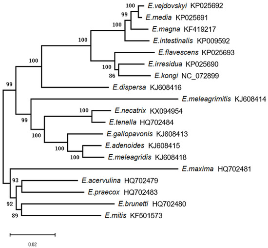 To investigate the phylogenetic relationship between E. kongi and other species of Eimeria, we aligned the mtDNA sequence of E. kongi with that of 18 Eimeria species from GenBank using ClustalX v2.1 (Table 1). Subsequently, a Neighbor-Joining tree was constructed using MEGA v10.2.6, and bootstrap analysis was performed with 1000 replicates.