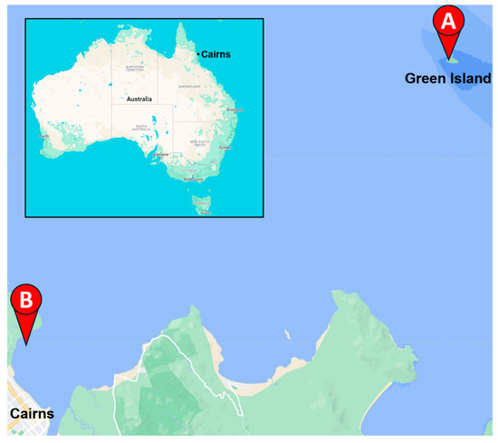 A map of seagrass collection locations around Cairns. The aerial and root parts of Halodule uninervis, Cymodocea rotundata, Syringodium isoetifolium, and Thalassia hemprichii were collected from Green Island (A), and Zostera muelleri was collected from Cairns harbour (B). Inset shows the location of Cairns in far north Queensland (FNQ), Australia. This image was created with the use of a map adapted from Google Maps.