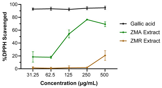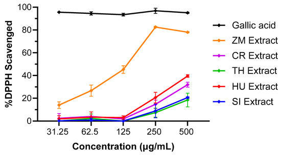 The DPPH-free radical scavenging activity by aerial or root crude extracts (31.25–500 μg/mL concentrations) of Z. muelleri. The data expressed represent mean ± SD from two independent experiments performed in triplicate (n = 6), visualized using GraphPad Prism 10.2.2. Gallic acid was included as a standard antioxidant compound for comparison.