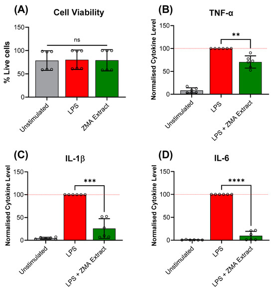 The (A) cell viability of human peripheral blood mononuclear cells (PBMCs) with aerial crude extract of Z. muelleri at a 100 μg/mL concentration after overnight incubation; and the normalized cytokine levels of (B) tumour necrosis factor alpha (TNF-α) (C) interleukin (IL)-1β, and (D) IL-6 released by the PBMCs stimulated with bacterial lipopolysaccharide (LPS). Bar plots show the mean ± SD from two independent experiments performed in triplicate (n = 6), visualised using GraphPad Prism 10.2.2. For cytokine plots, LPS treatment groups were normalized to 100%. Statistical analysis was performed using a Welch’s t-test, where ns = not significant, ** = p < 0.01, *** = p < 0.001, **** = p < 0.0001.