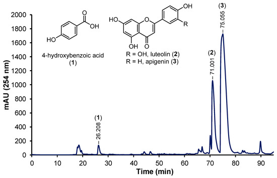 The preparative high-performance liquid chromatography (HPLC) chromatogram (254 nm) of the methanol (MeOH) fraction of the Z. muelleri aerial extract and chemical structures of isolated compounds 4-hydroxybenzoic acid (1), luteolin (2), and apigenin (3).