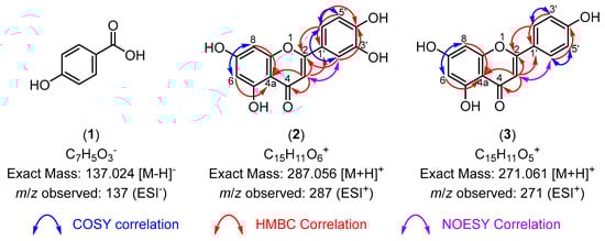 The key two-dimensional (2D) nuclear magnetic resonance (NMR) correlations and low-resolution mass spectrometry (LRMS) data used for the structural elucidation of compounds (1)–(3). No 2D NMR spectroscopy was performed on 4-hydroxybenzoic acid (1) due to its structural simplicity.