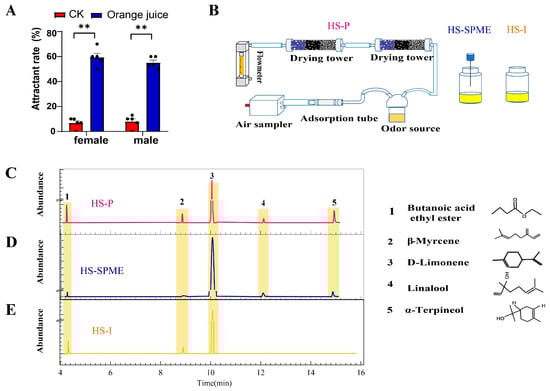 The behavioral response and the identification of volatile compounds from the orange juice. (A) The attractiveness of orange juice to both male and female flies. (B) schematic drawing of the collection system. (C–E) The volatiles with high abundance were identified by gas chromatograph-mass spectrometry (GC-MS) utilizing HS-P, HS-SPME, and HS-I sampling methods. (N = 5, ** p < 0.01).